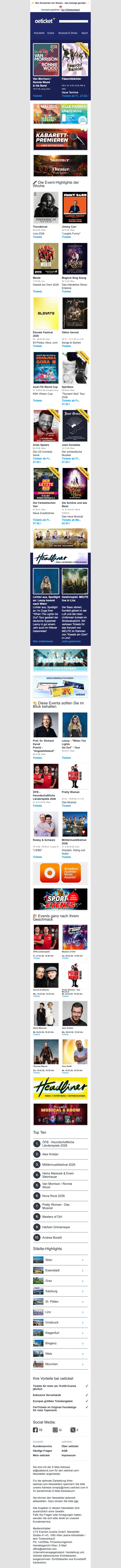 Entdecke schnell und einfach die besten Events in deiner Stadt. Oeticket.com zeigt dir, was in Wien, Salzburg, Graz und anderen Städten los ist.